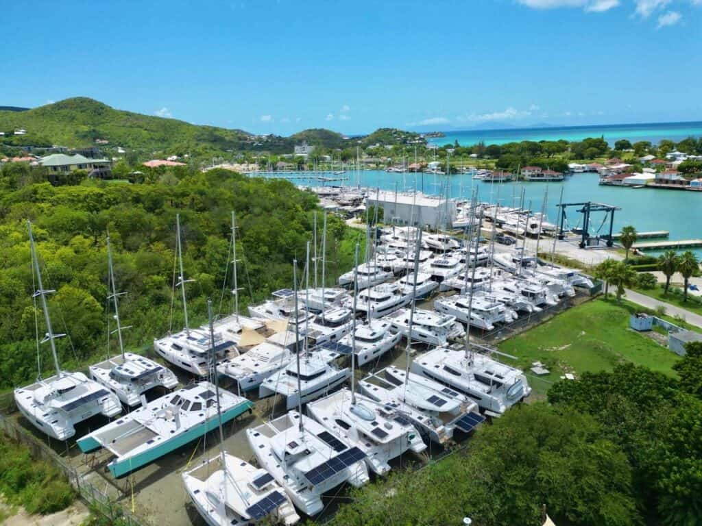In recent years, Jolly Harbour Marina has experienced rapid growth in catamaran traffic. To meet the needs of this expanding customer base, the facility constructed 80-foot twin piers and developed a dedicated catamaran storage yard. Building on these improvements, management invested in a 75-ton Marine Travelift boat hoist and, most recently, a self-propelled 40-ton Marine Travelift transporter equipped with external catamaran arms, designed specifically to streamline catamaran handling.